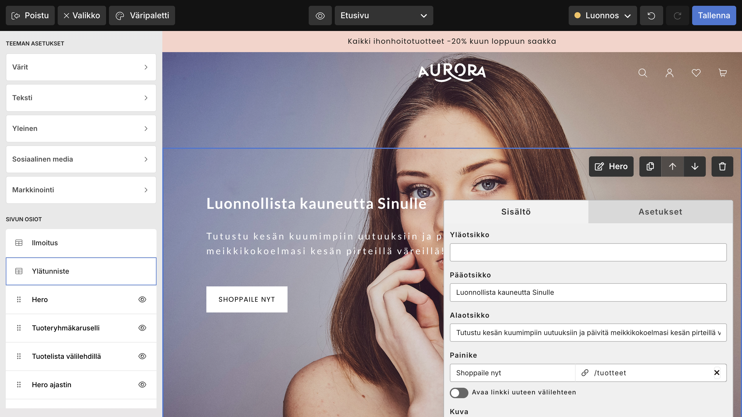 Valmiskaupassa sukellat ilmaisten, modernien ja helposti muokattavien teemojen maailmaan. Verkkokaupan ilme ja sivut rakentuvat uskomattoman vaivattomasti valmiiksi suunnitelluista osioista, joita löytyy useampi kymmenen erilaista. Intuitiivisen teemaeditorin avulla annat luovuutesi loistaa ja rakennat mitä hienoimpia sivuja verkkokauppaan. Brändisi mukaisen värimaailman luominen onnistuu helposti valmiiden väripalettien avulla. Luonnostele ja rakenna ulkoasua kaikessa rauhassa. Vaiheittaisen julkaisun ansiosta voit tarkastaa kaikki muutokset ennen niiden julkaisua, mikä antaa sinulle täyden hallinnan lopputulokseen.